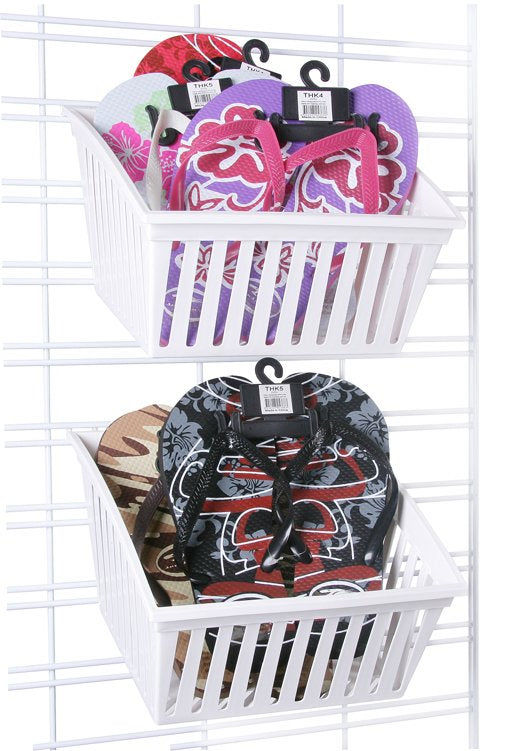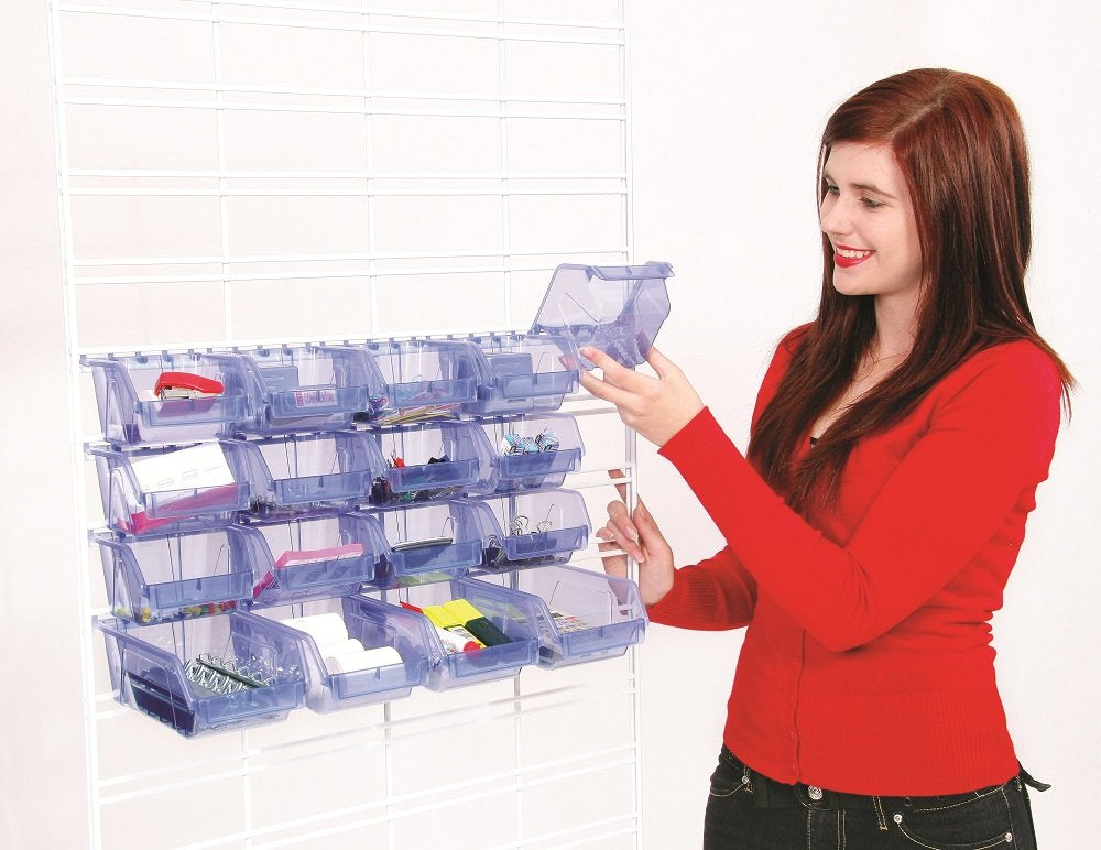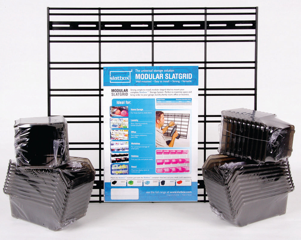 Versatile and flexible, it is perfect for a variety of uses and can be customised into a variety of shapes and sizes. This customisation is the reason that slat grid is so popular – heavier and easier to use than its smaller cousins, it’s perfect in a variety of environments, including shop fitting. A myriad of special kits allow you to create any shape or size of slat grid structure for your needs, and create a unique shelving system designed specifically for you. You can clip a large sheet into smaller sheets, or buy them pre-clipped. You can also buy them in a variety of colours and sizes, though it’s most common to buy them in sheets and cut them down, or buy kits with the accessories and shelving extras included. Each panel can be attached to wooden frames, used as shelves, or attached direct to the wall with the screws and mounts provided. Once attached, they can be used with most accessories, including the Slatbox storage solutions which come in a range of plastic storage boxes, bins and tubs.